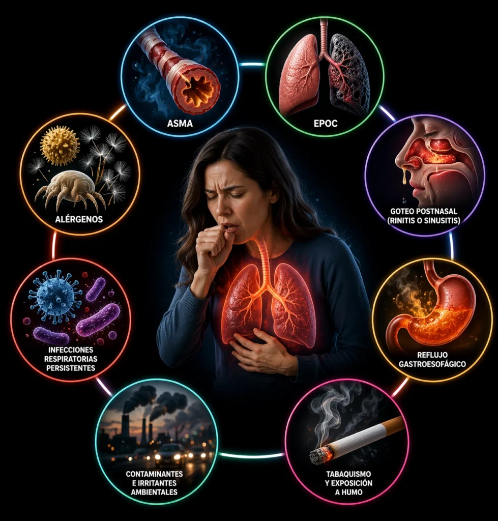 Una de las causas más comunes es el asma, especialmente si la tos aparece en la noche o al hacer ejercicio. También puede estar relacionada con infecciones respiratorias mal tratadas, como la bronquitis.